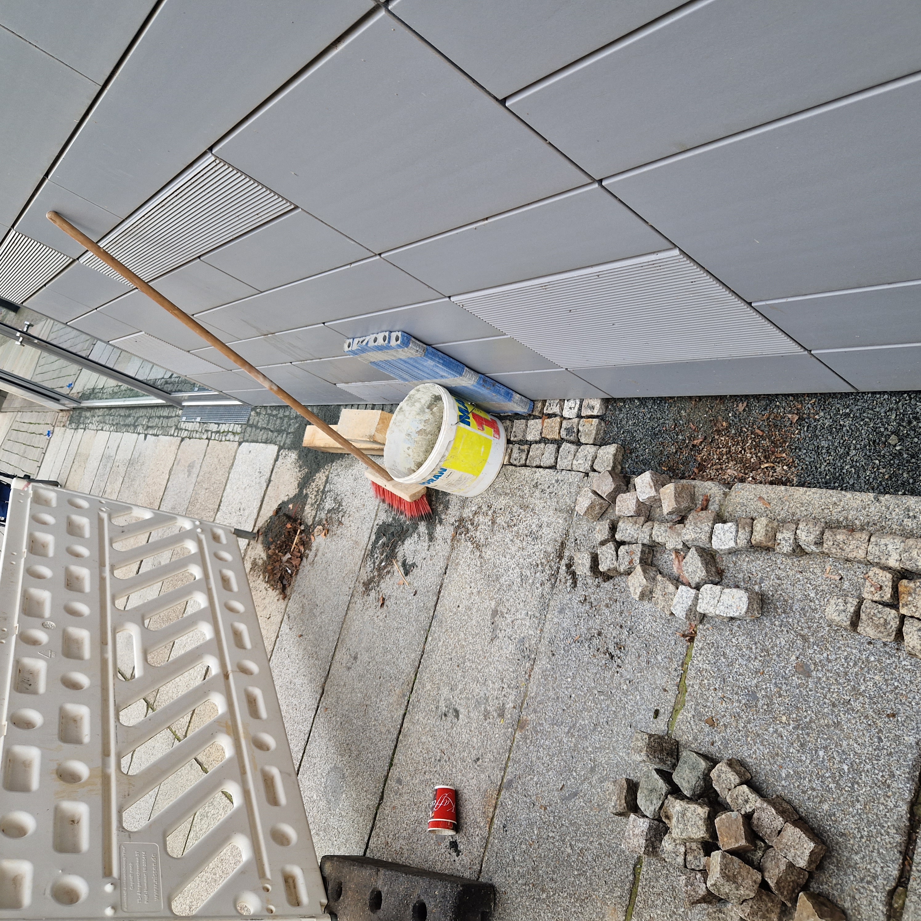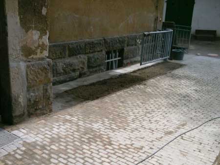 Sanierung eines Kindergartens in Dresden, mit Trockenlegung, Verlegung des geborgenen Kleinpflasters aber auch das Ergänzen von fehlenden Sandsteinen.