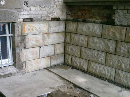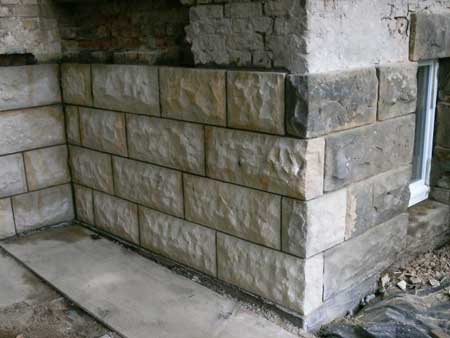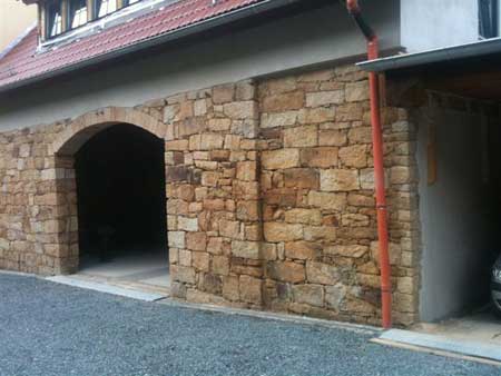 Eine vom Einsturz bedrohte Sandsteinwand wird wieder aufgebaut in Langenhennersdorf.